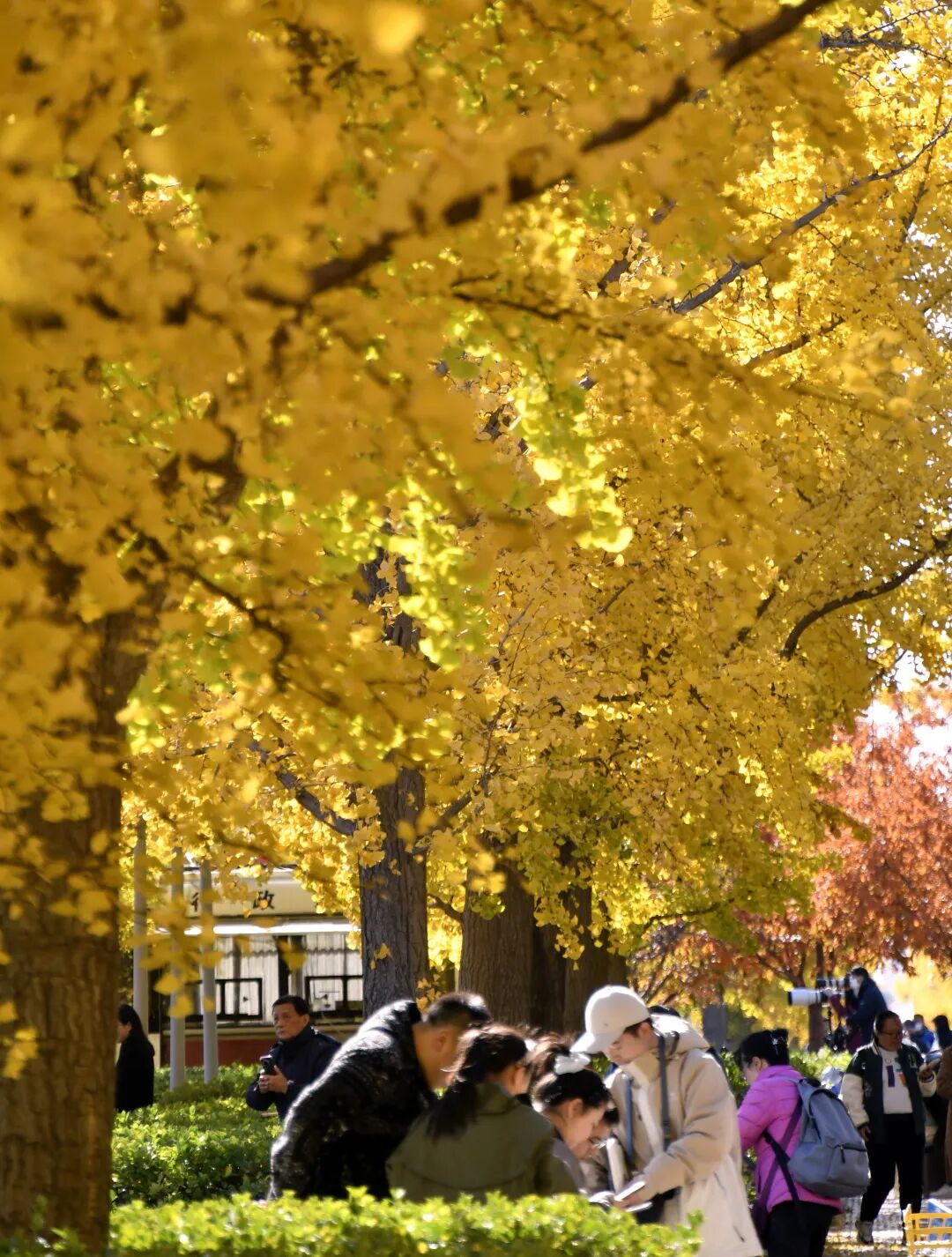 深秋时节,北京市街头和公园内的银杏等树木挂满黄叶。图为11月2日,游客在奥林匹克公园观赏银杏。新华社记者 李欣 摄