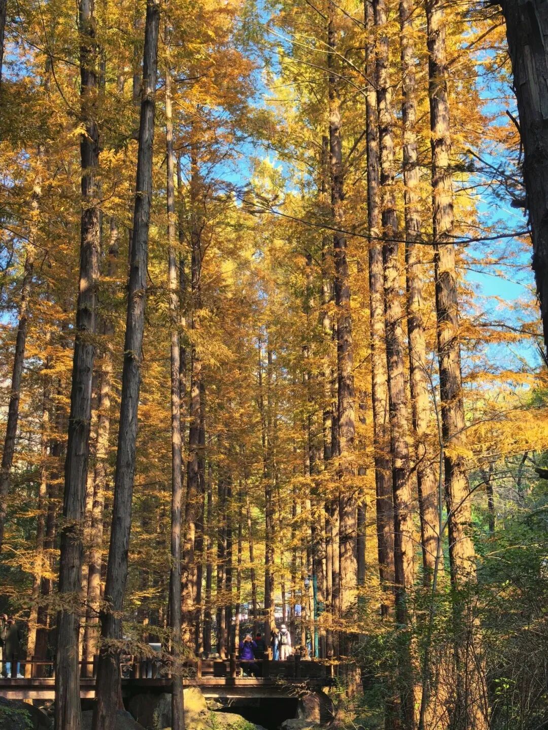 午后,国家植物园樱桃沟。阳光穿过水杉林的橙红与金黄,在溪流与小径上投下斑驳光影。