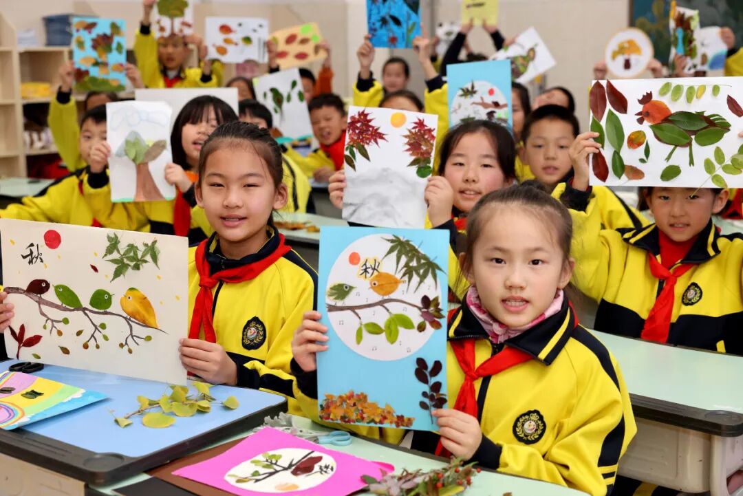 10月31日,在山东省枣庄市市中区东湖小学,学生们在展示利用落叶制作的“树叶画”。孙中喆 摄